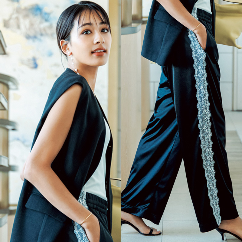 サイドレースパンツ¥55,000(マグニバーグ/アダム エ ロペ)ジレ¥42,900(ウィム ガゼット/ウィム ガゼット 玉川髙島屋S・C店)タンクトップ¥9,350(プラージュ/プラージュ 代官山店)片耳ピアス¥95,700バングル¥47,300(ともにビジュードエム/ビジュードエム六本木ヒルズ)バッグ¥49,500(プンティ/エルディスト ショールーム)サンダル¥66,000(ネブローニ)