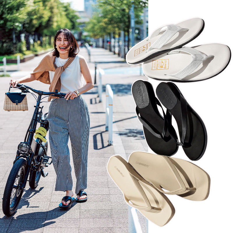 〈右〉アイボリーサンダル¥29,700(アイランドスリッパ×エイチ ビューティー&ユース/エイチ ビューティー&ユース)〈中央〉黒サンダル¥22,000(ラオコンテ/フラッパーズ)〈左〉トングサンダル¥13,200(カミナンド/カレンソロジー 二子玉川)
