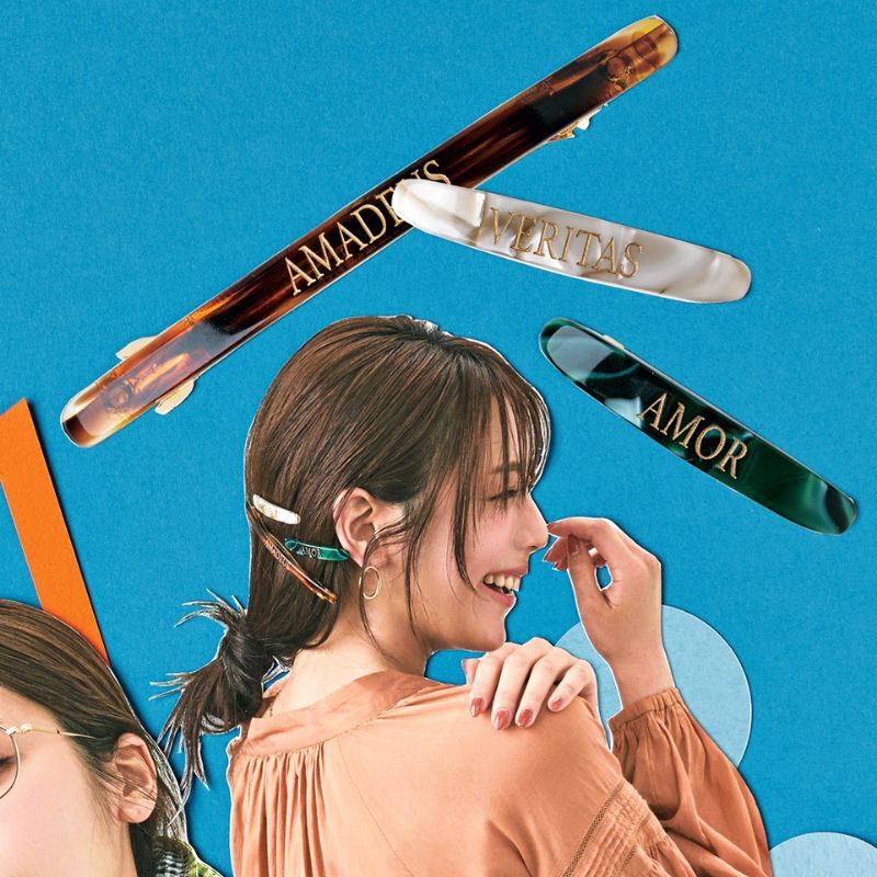 1本でもたくさんでも、好きな所に留めるだけで手の込んだオシャレが叶うバレッタ。べっ甲に英文字のデザインが新鮮で、大人心をくすぐる♡