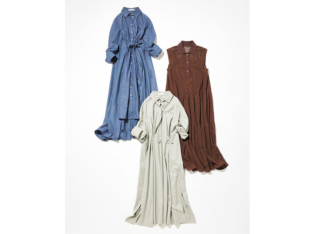 〈上〉360度着映えるリッチシルエット&ストライプでキリッと感を後押し。ワンピース¥148,500(パルマーハーディング/トゥモローランド)〈中〉夏のブラウンが新鮮、トレンドのメッシュ素材で軽やかに。ワンピース[参考商品](カデュネ)〈下〉プレゼンにも活躍しそうなタイ付き。ワンピース¥67,100(ebure/リトルリーグ インク)