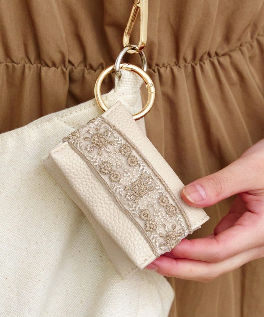フロントの刺繍リボンが繊細で、フェイクレザーが上品な、高見えするファスナーポーチもあります。バッグの中でもかさばらないサイズ感で、こちらもハンドルなどに取り付けられる仕様です。
