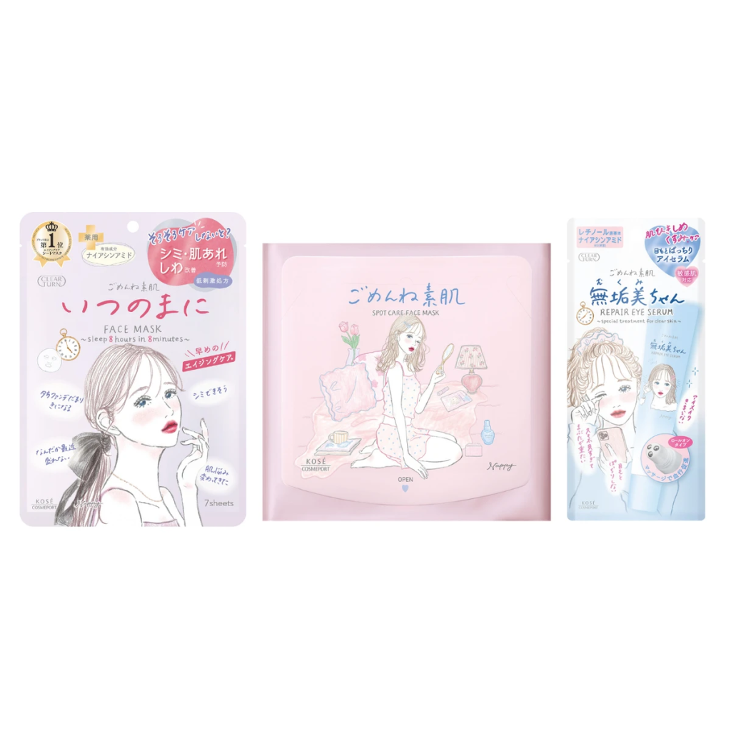可愛らしい女の子のイラストが特徴のごめんね素肌シリーズより新たに3アイテムが登場。シミや肌あれ、目もとの悩みに寄り添います。