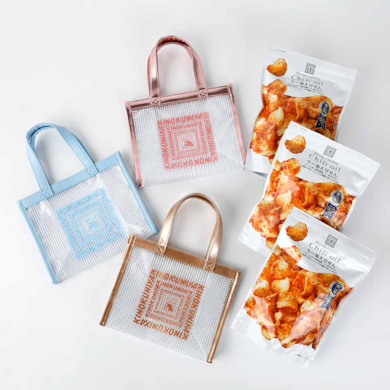 ミニクリアバッグ3色と手軽で美味しいスナックのギフトセットです。ラー油の辛さと海老の甘さがやみつきになる「ラー油えびせん」3つ入りと、人気スナック3種のミックスセットが登場。夏の帰省土産におすすめです。
