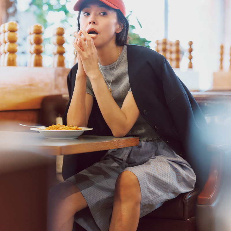 パンツ¥17,930(メゾンスペシャル/メゾンスペシャル 青山店)ジャケット¥82,500(アキラナカ/ハルミ ショールーム)Tシャツ¥2,420(ヘインズ/ヘインズブランズ ジャパン カスタマーセンター)キャップ¥8,250※WEB SHOP限定(ザ シンゾーン/シンゾーン ルミネ有楽町店)シューズ¥132,000(トリッカーズ/トリッカーズ 青山)リング¥30,800チェーンネックレス¥20,900パールチャーム¥4,400ゴールドチャーム¥16,500(すべてラムダ)