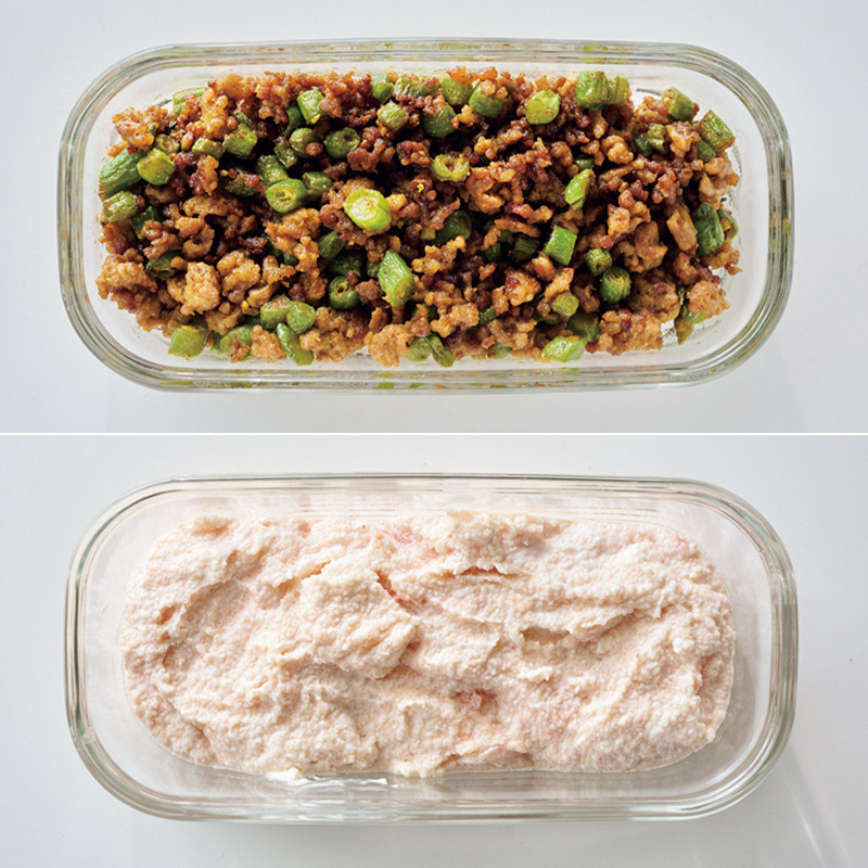 :フライパンにオリーブオイル小さじ1をひき中火にかけ、豚ひき肉250gを加えよく炒め、小口切りしたいんげん14本程度を入れ、さらに炒める。