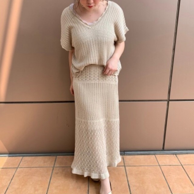 ボディラインを美しく見せることに定評があるフェティコらしい、絶妙なカーブシルエットのデニム。レーシーなポロニットを合わせた今季の王道ワンツーコーデも、ひと味違った印象に仕上がる。
