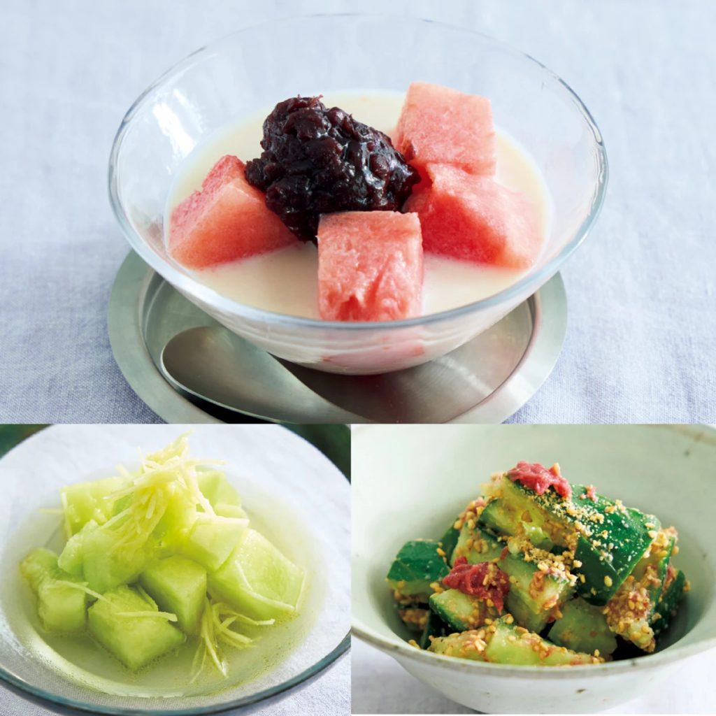体の熱を冷ますメロンを使ったサラダ。体を暑くせずにお腹を温めるしょうがをミックスすることでお腹の冷えは予防。「血」の巡りをよくする効果のある酢も使用。