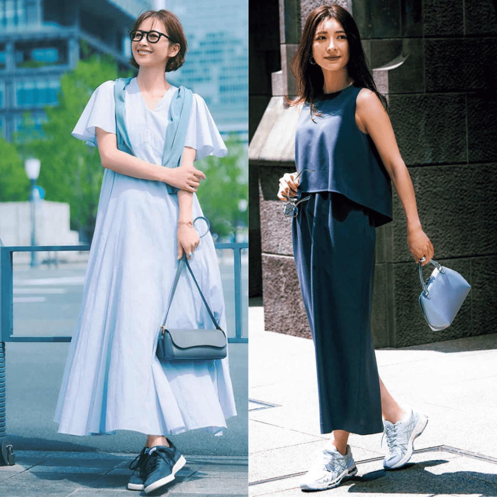 知的なブルーのワンピースには、同系色のスニーカーを合わせて上品&爽やかに。トレンドのシアーカーデを肩掛けすれば、今っぽさも。落ち着いた色味のローカットスニーカーはどんなスタイリングにも合わせやすいので、スポーティ初心者さんにも投入しやすくておすすめです。