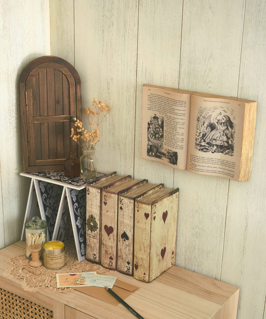 本をモチーフにしたインテリアもあります。こちらは不思議の国のアリスの表紙と、ハートのクイーン、スペードのデュースのデザインを組み合わせた本型のドロワーボックス。引き出して小物を収納できます。