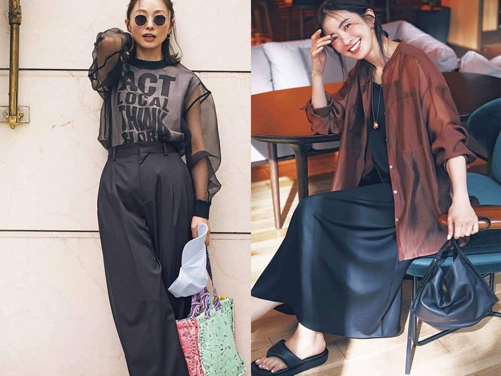 シンプルな黒ワンピースも、シアーシャツを重ねるだけで今っぽさ抜群のコーデに。ともすればご近所コーデになってしまいそうな楽ちんワンピ×ビーサンも、お出かけ仕様にシフトします。