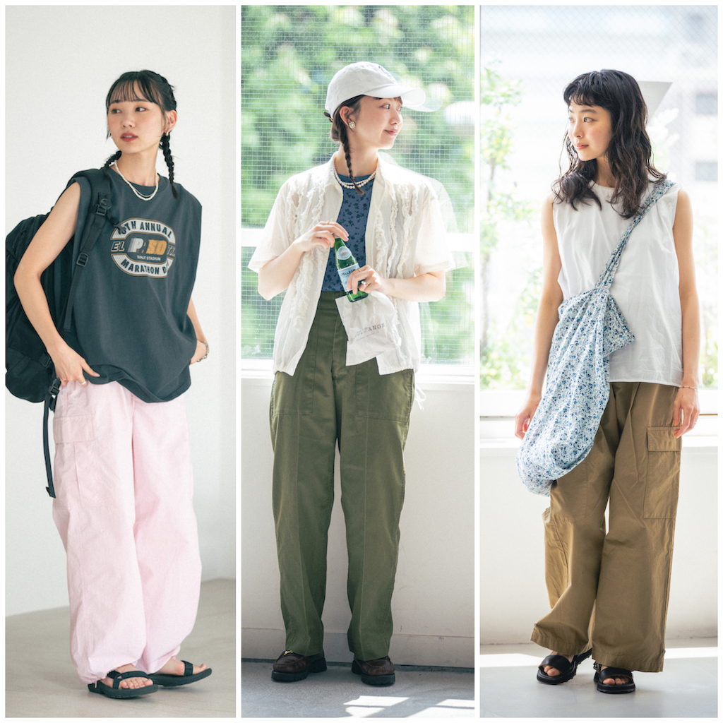 脚にフィットしないルーズなカーゴパンツなら真夏でも涼やか。ノースリーブトップスでヘルシーに肌見せして軽やかさをキープ。キュートな小花柄バッグをアクセントにして。