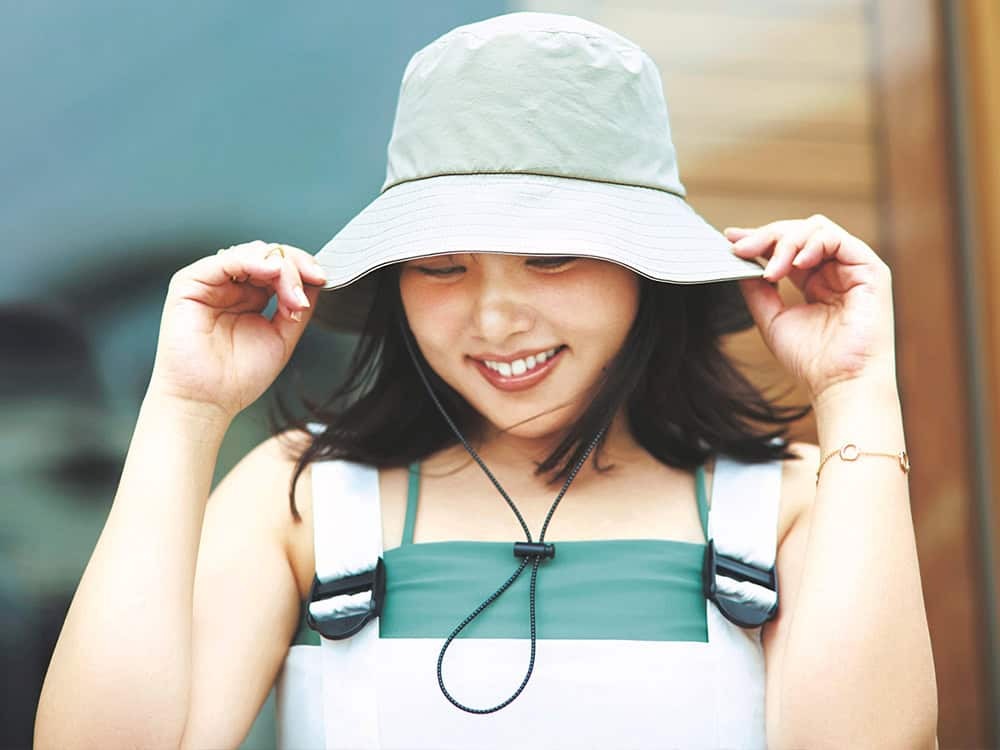 ハット¥ 3,990[撥水・接触冷感・UVケア・防シワ](アンフィーロ)サロペット¥ 5,489(ur’s)チューブフレア水着¥ 17,600(カオス/カオス丸の内)リング¥17,820(ピニャッタ/ZUTTOHOLIC) ブレスレット¥151,800(ウノアエレ /ウノアエレ ジャパン)