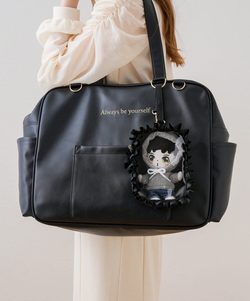ストラップ部分はバッグに取り付けると持ち運びが楽ちん。先ほどの推し活バッグにもベストマッチです。ぬいぐるみ以外にもアクスタなどを入れるのも◎。カラーはブラックとベージュの全2色です。