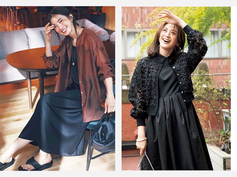 シンプルな黒ワンピは、シアーなブラウンシャツを重ねるだけで印象が秋モードに一変。艶のある素材なので、ワントーンでも単調にならずこなれた雰囲気に仕上がります。ゴールドのロングネックレスを効かせて、リラックスしながらも余裕のあるワンピスタイルにアップデートを。