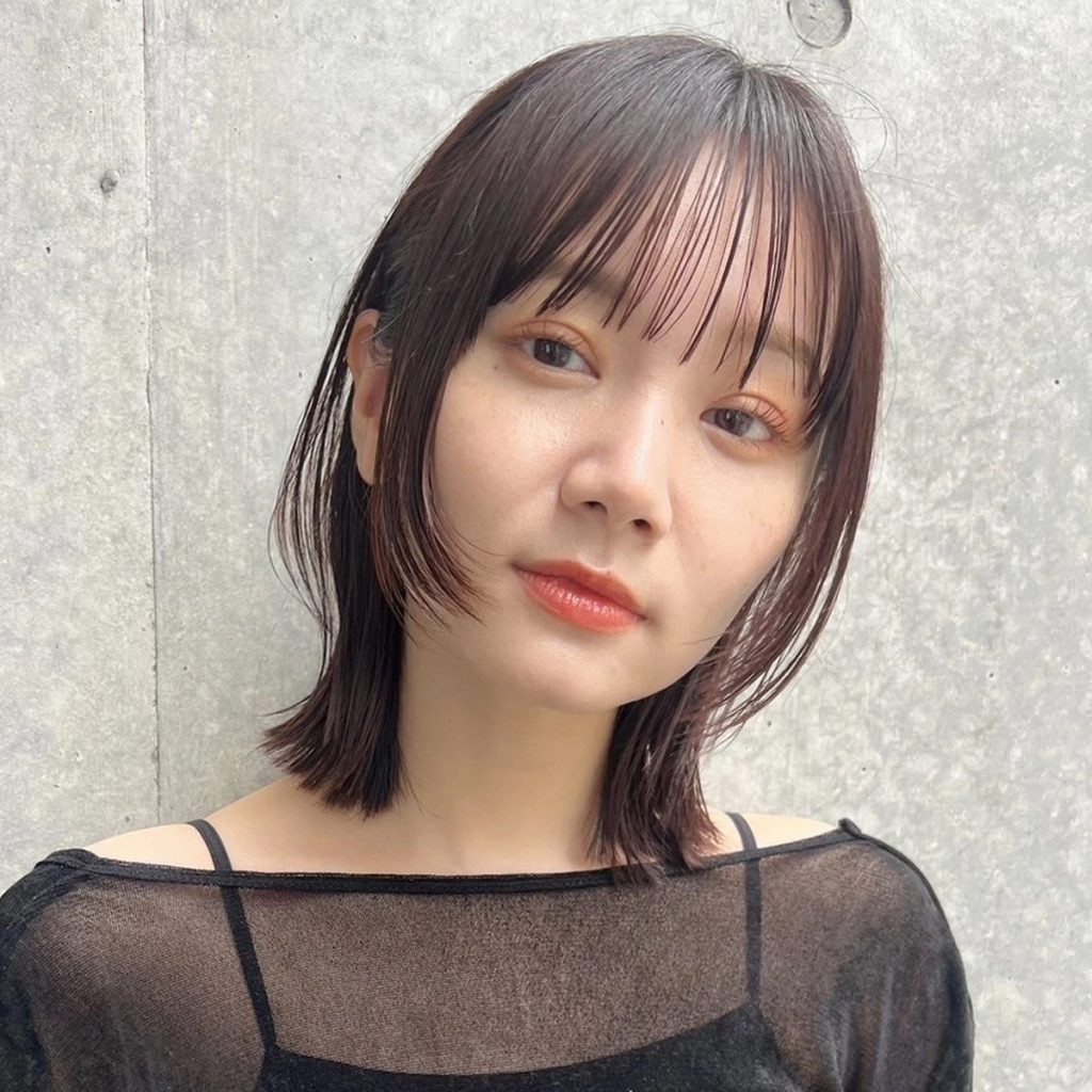 長めのボブをベースに、顔まわりのみにレイヤーを入れて小顔見え効果をプラス。毛先にかけて重さを残してあるため、軽やかな見た目ながらもまとまり感はキープされて扱いやすいスタイルに。前髪は目の上ラインでカットした、抜け感のあるシースルーバングに。