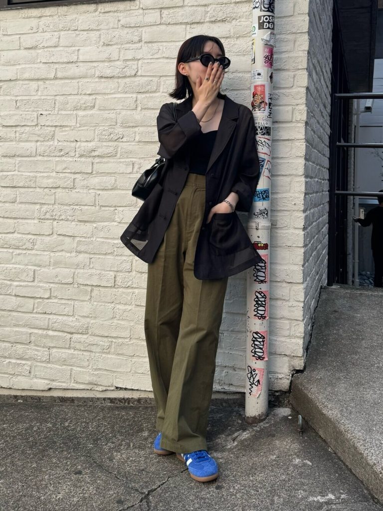 定番のカーキパンツに黒のインナー&ジャケットを重ねた、王道の辛口コーデ。シンプルな色合わせながらも、透け感のあるジャケットが軽やかな抜け感を演出し、重たくなりがちな秋の装いを鮮度よく仕上げます。さらに足元には鮮やかなブルーのスニーカーを効かせ、ストリートライクな遊び心をプラス。小物は黒でまとめることで全体のトーンを引き締め、カジュアルとモードのバランスを楽しめる大人の都会派スタイルが完成します。