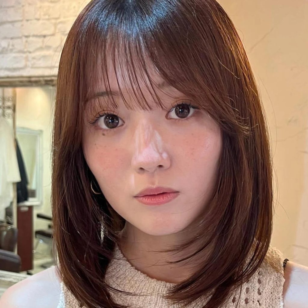 鎖骨レングスのミディアムベースに、顎下からレイヤーをオン。シースルーバングで抜け感を与えつつ、こめかみ部分は長さをキープして小顔見え効果を演出。艶やかなチョコブラウンカラーで大人可愛く仕上げる。