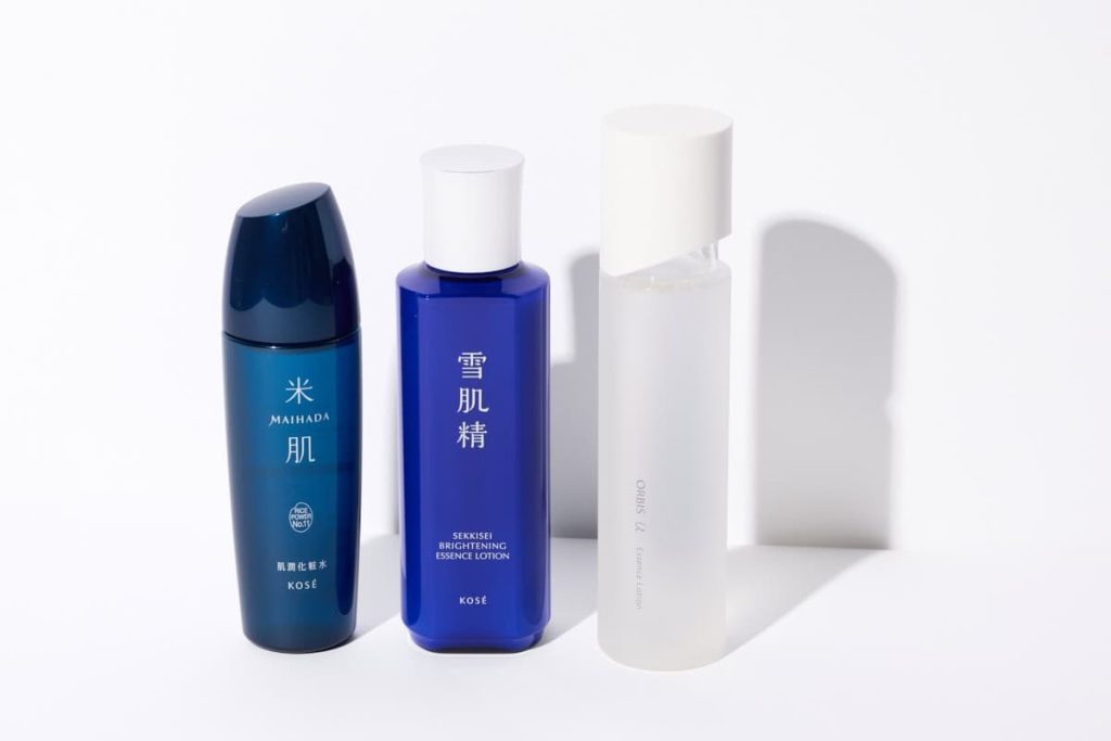 (左)ライスパワー®No.11をはじめ保湿成分がごわついた肌をうるおいで満たす。米肌 肌潤化粧水 120ml ¥5,500/コーセー (中)Wグリチルリチン酸ジカリウム配合で、美白と肌荒れ予防を両立。冷やして使うと鎮静&毛穴引き締め効果もUP。薬用雪肌精 ブライトニング エッセンス ローション[医薬部外品]200ml ¥3,850(編集部調べ)/コーセー (右)とろりとしたローションが、肌に触れるとパシャっと弾けるようになじむ。オルビスユー エッセンスローション[医薬部外品]180ml ¥2,970/オルビス