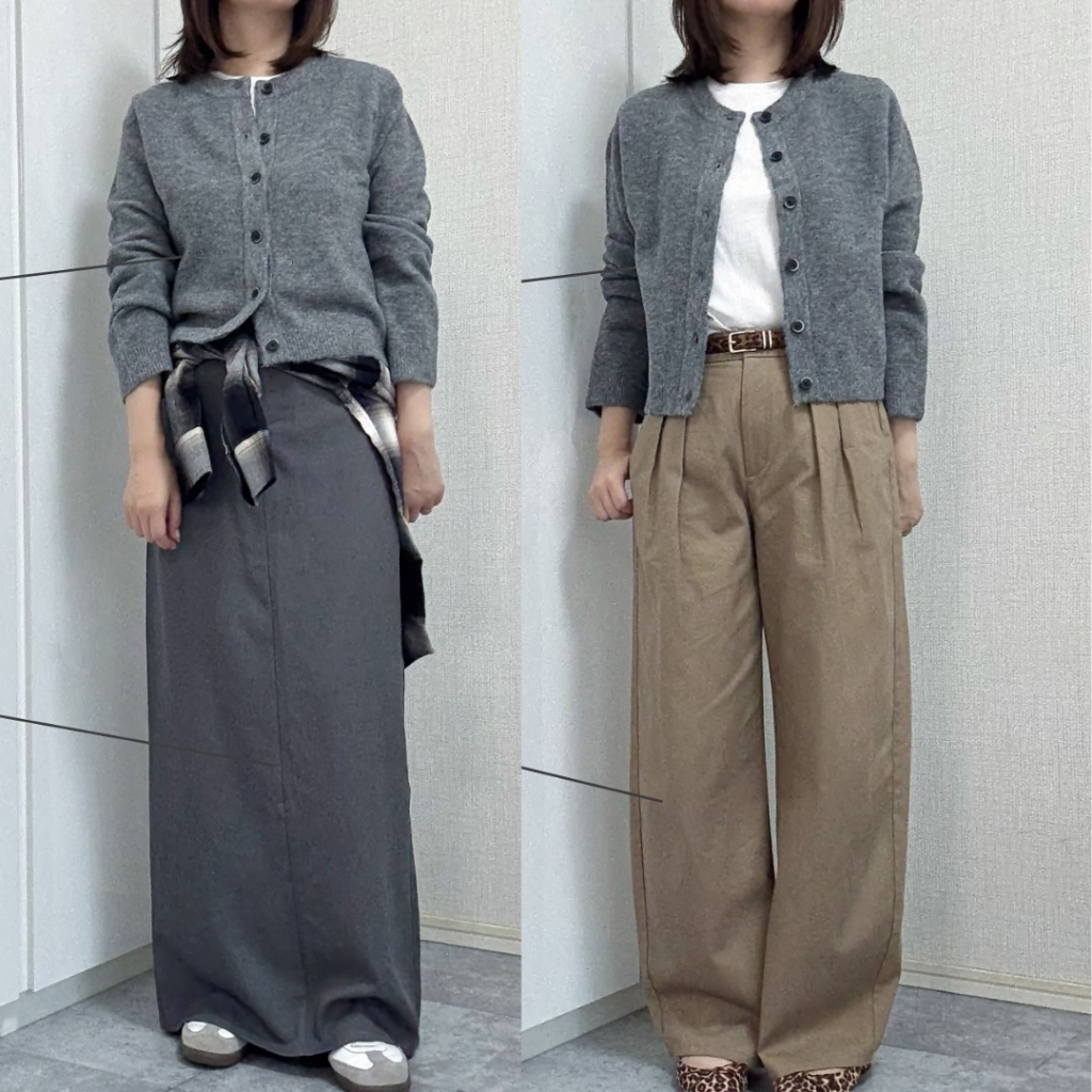 カーディガンはボタンをしめて羽織ではなくトップスとして使えるので着まわし力抜群!