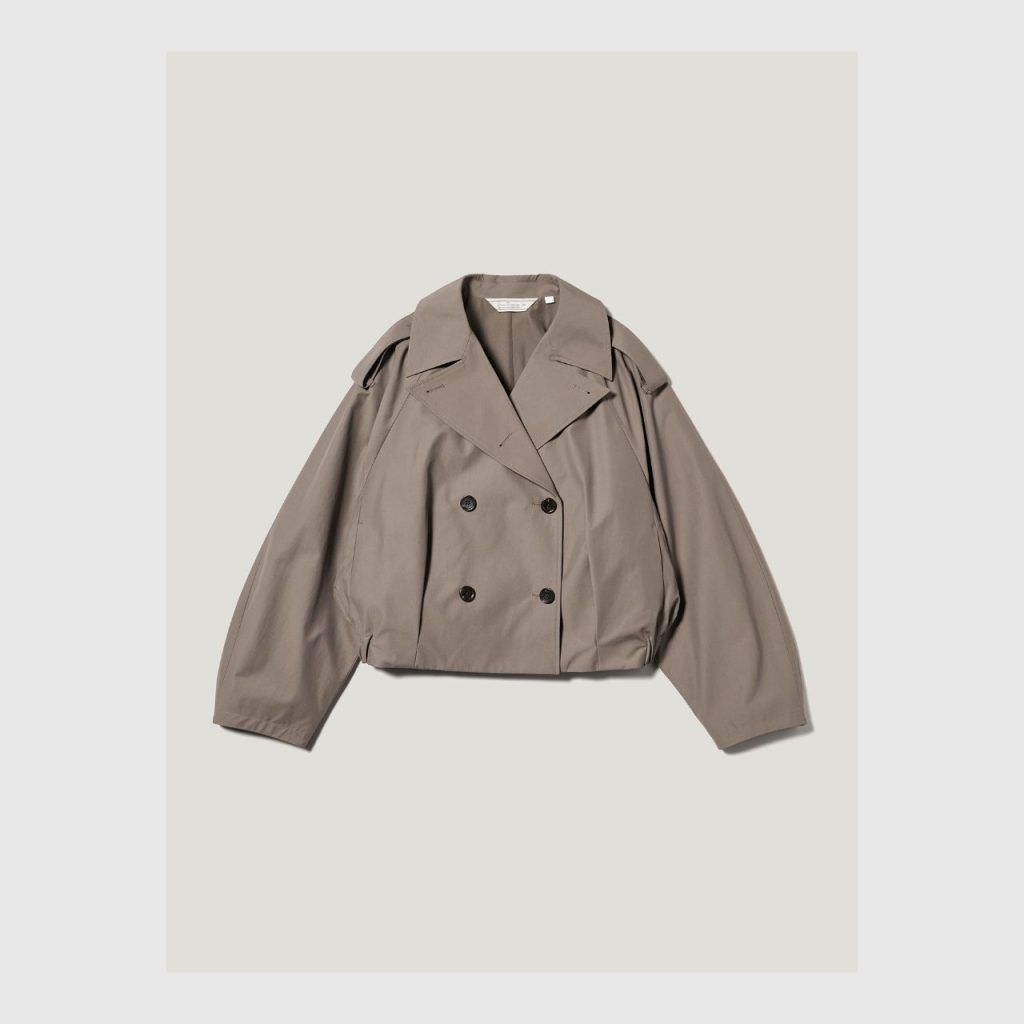 上品なオリーブカラーが使いやすいショート丈のトレンチコート。後ろ裾に入ったギャザーが生み出す立体的なコクーンシルエットで、着膨れ知らずのすっきりとした印象に。前を開けた際のシルエットも美しくキマります。左右にポケットが付いていたり、自転車移動でも裾を気にせず着られる実用性も魅力。