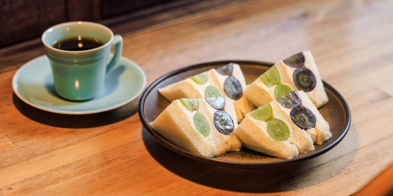 看板メニューは、「季節のフルーツサンド」。旬の果物と生クリームがたっぷり詰まった大人気の一品です。フルーツはその時期に一番よいものを使用。この日は、秋限定のシャインマスカットとピオーネ、梨のサンドをいただきました。みずみずしい2種類のブドウに、梨のシャキッとした食感がよいアクセント。生地とフルーツ、生クリームがどれも絶妙にマッチし、最後までぺろっと食べ進められます。