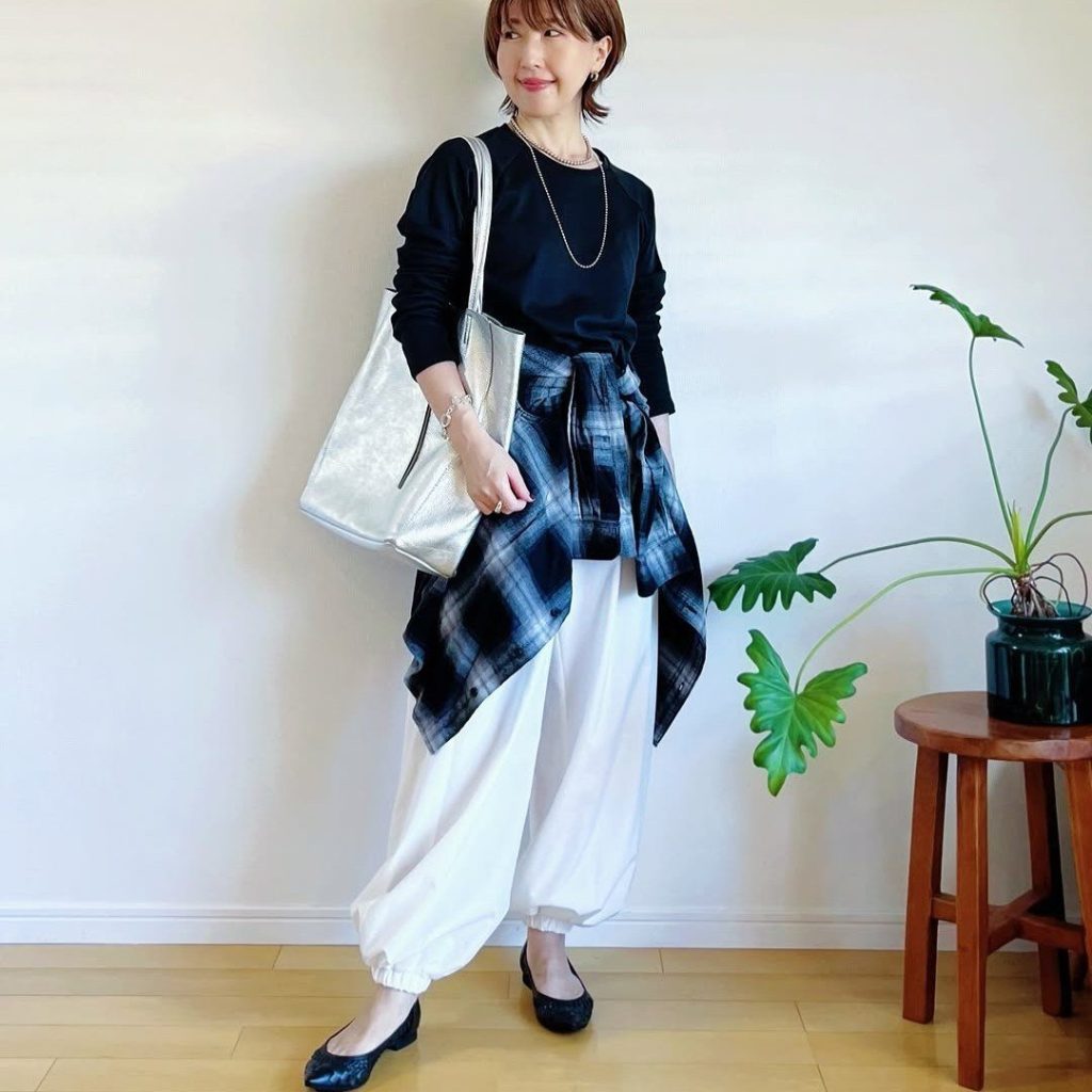チェック柄のシャツを腰に巻くことで、コーデにメリハリと立体感がプラスされます。