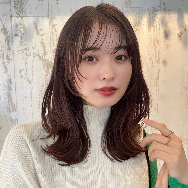 長めに設定してカール感をつけたサイドバングや、顔まわりを包み込むような動きをつけたレイヤーカットなど、顔を小さく見せる要素を随所にちりばめたミディアムヘア。ツヤ感のあるブラウンを合わせることで、レイヤーとの相乗効果により抜け感のある仕上がりに。服の色味が暗くなりがちなこれからの季節にうってつけ!