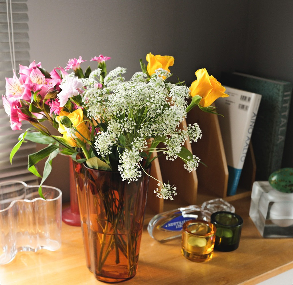 「Aaltoがデザインした曲線が美しいフラワーベース。カラー、デザインには様々なバリエーションがあり、組み合わせも楽しめます」