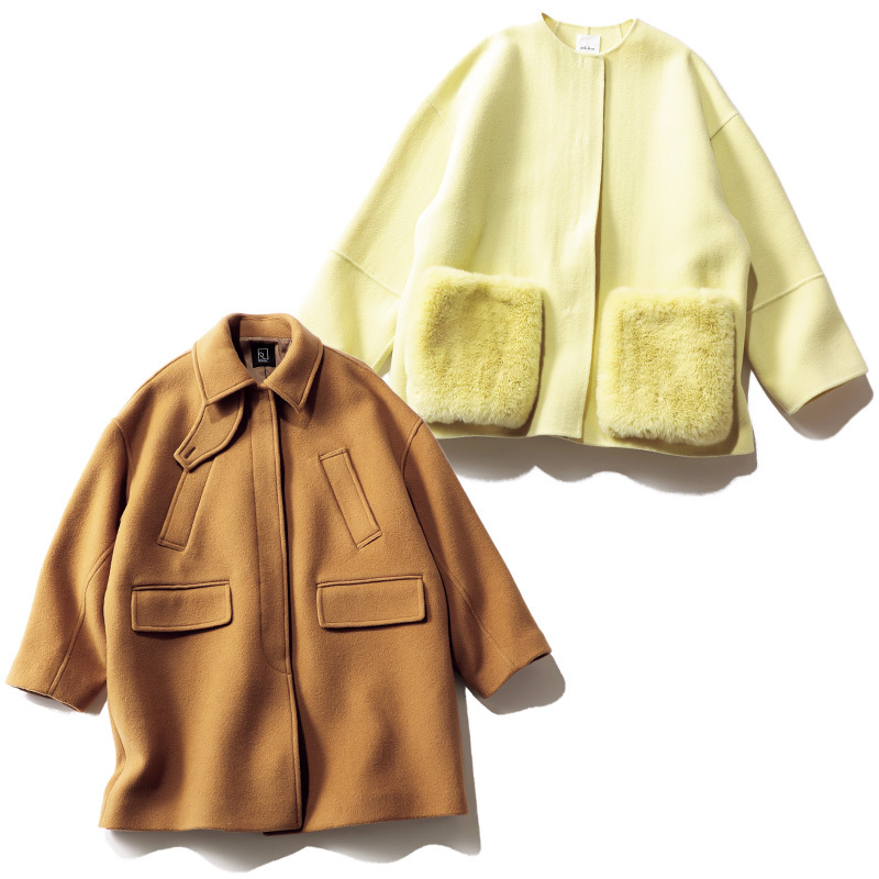 昨年の一番人気コートにグログランリボンとゴールドホックを足しアップデート。着脱自在なファーを取り外せばベーシックなデザインになり、気分やTPOに合わせて表情を変えられるのも魅力。ダークトーンにまとまりがちな冬のワードローブの救世主に。合わせやすく上品で絶妙なイエローの発色はさすが。