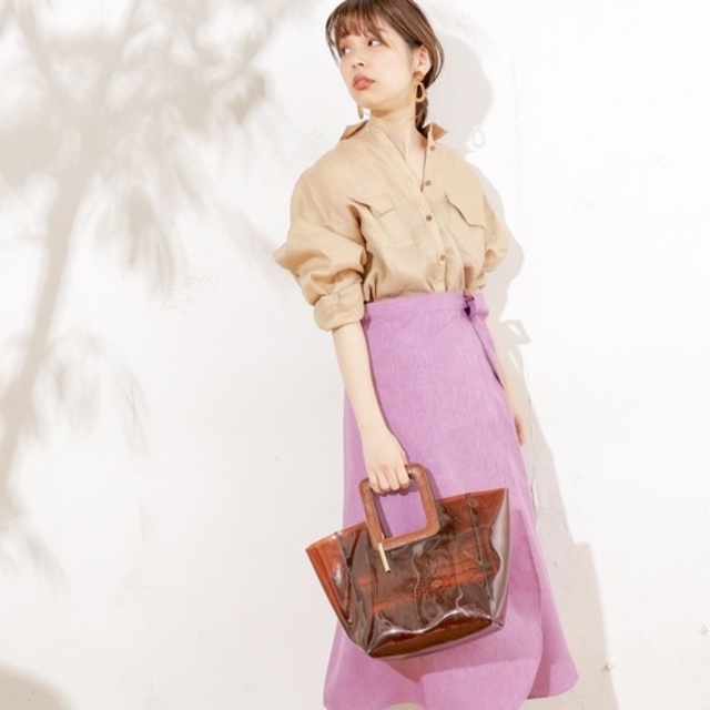 次はブラウンのベロアスカートと合わせてトレンド感のあるコーデにしてみました。すっきりとしたニットなので、ボトムスはどんな形でも合わせやすいのも嬉しいポイントです。