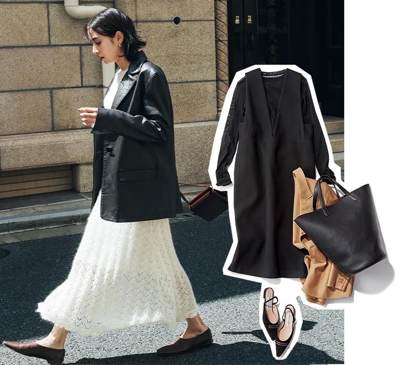 オフの日には甘く着こなしているニットワンピースも、レザーのテーラードジャケットでピリッと締めればオフィスモードに。秋冬はジャケットを羽織るだけで表情を変えられるので、甘めなデザインのワンピースにも挑戦しやすいはず。華やかさときちんと感があり、はじめましてのシーンにもぴったりです。