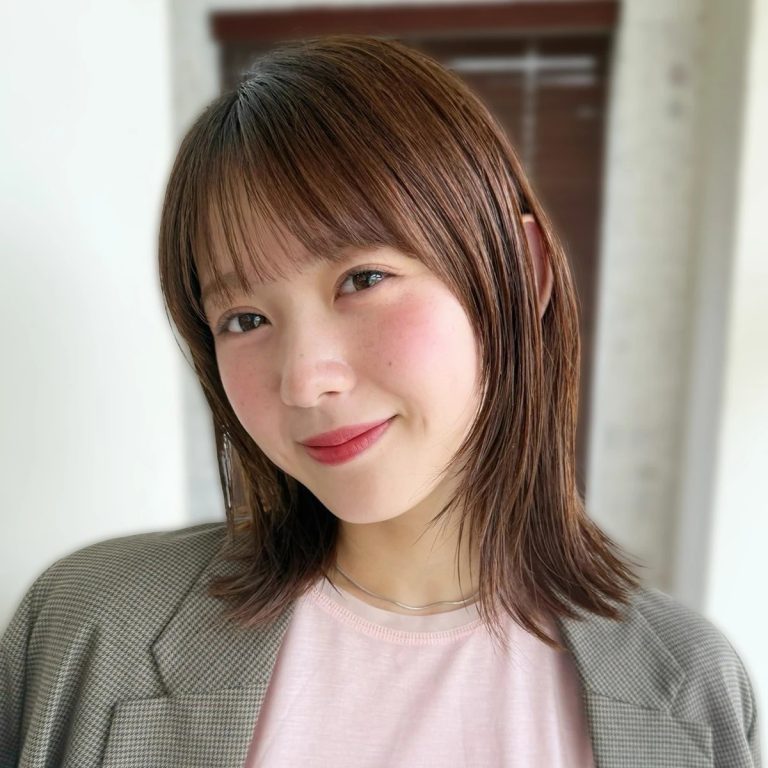 こっくりとしたブラウンが温かみのある雰囲気を演出する、これからの季節にぴったりのミディアムヘア。ツヤやかな質感に仕上がるように色をブレンドすることで、夏に受けたダメージが目立たないようカバーして、潤い感たっぷりの髪にシフト。重くなりすぎないように、レイヤーを入れて適度な軽さもプラス。
