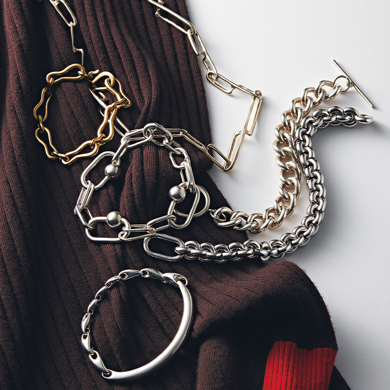 味気なく見えがちなタートルニットこそ、重ねるだけで雰囲気が変わる“チェーンネックレス&ブレスレット”が心強い相棒。今回は、洗練されたデザインが光るボリュームチェーンやコンビカラーの名品を中心に、手元と首元で冬の定番を立体的に仕上げるコツをまとめました。