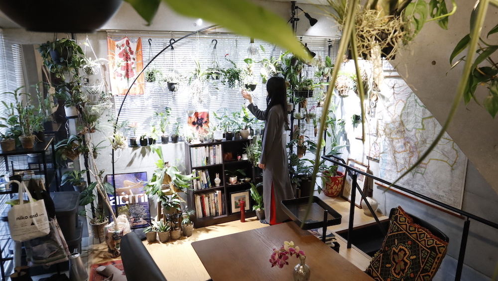 無機質なコンクリート打ちっぱなしのメゾネット空間を、リラックススペース、仕事&食事スペースとしっかり分けつつ、自分にとって大切なたくさんの植物やアート作品で埋めつくしていたmoeさん。ひとつひとつのものに愛着を持って接していらっしゃる様子が素敵でした。