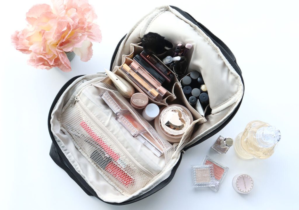 シンプルなブラックのナイロン素材は、どんなインテリアやシーンにもマッチ。コスメ収納だけでなく、ガジェット類や文房具をまとめれば、どこでも自分だけのデスクに早変わりします。