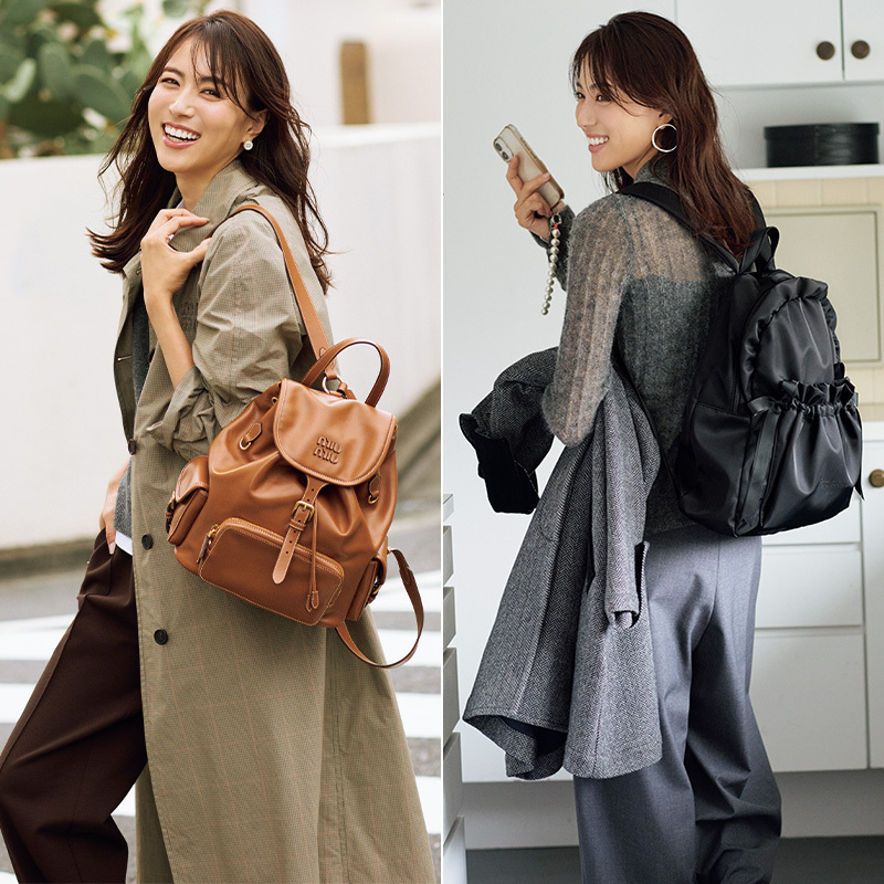 今、持つだけで旬になるITバッグの宝庫・ミュウミュウには、実はリュックのラインナップが豊富。上質なカーフレザーできれいめ服にもコーディネートしやすい。シーンも季節も問わず、タイムレスに使えるから投資の価値あり!