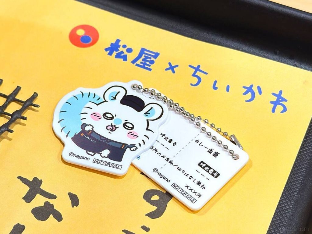 店頭の券売機やタブレットから「松屋 ちいかわのすき焼き鍋膳」を注文すると、全6種からランダムで1個オリジナル食券キーホルダーがもらえます。松屋のユニフォームに身を包んだちいかわたちと一緒に松屋の食券をイメージした食券がセットになったキーホルダーです。