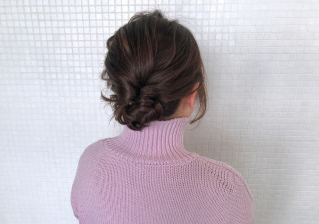 38mmのコテで全体をふんわりとした内巻きに。耳前は顎先に向かって降ろしながら内側に巻き、表面は毛束を引き出して毛先をワンカールさせて、ふんわりとした空気感を演出。仕上げにバームをバックとサイドの内側から馴染ませて、表面→前髪の順に手ぐしで全体の丸みを整えればOK。