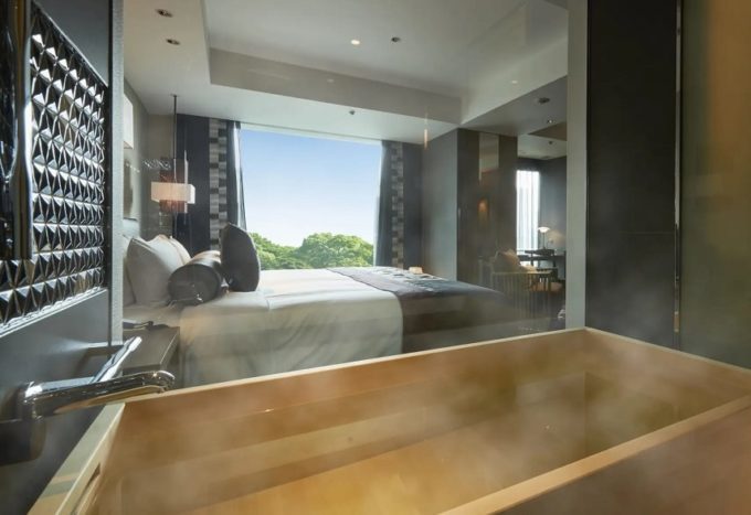 全48室のスイートルームは、一つの部屋のなかで寝室・リビング・ダイニングなどスペースが分かれています。いろんな滞在シーンに合わせて、多彩なくつろぎ方を楽しめます。こちらは寝室。