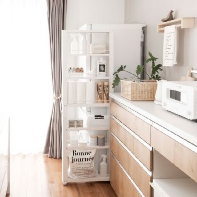 隣には、IKEAの白いキャビネットを置くことによって、収納力を確保。細々としたものをなんでも入れておける棚は、買ってよかったアイテムだそう。上はお気に入りのものを並べたスペースに。
