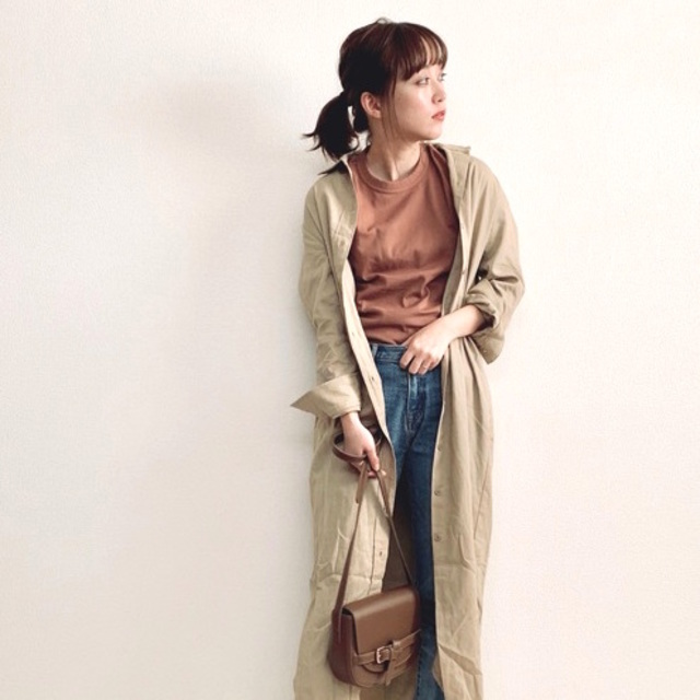 オーバーサイズのミドル丈トレンチをさらっと羽織った大人カジュアル。空気をはらむシルエットがやわらかさを加えつつ、動きのある裾が軽やかな印象に導きます。デニムのルーズさはそのままに、足元はレディなシューズでほんのり品をプラスすると◎。この“ゆる×きちんと”のさじ加減が、頑張りすぎない洗練スタイルに直結。