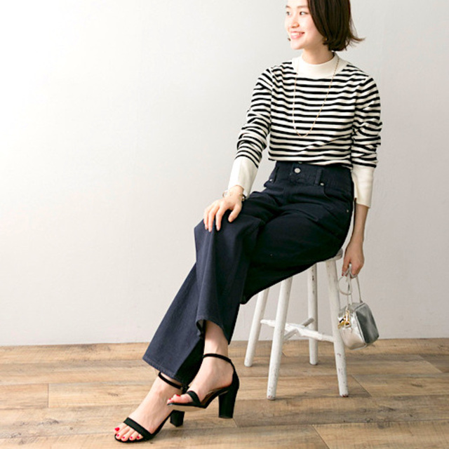 爽やかなボーダーでほんのり春を先取りしつつ、ジャケットや小物は黒で統一。全体をきゅっと引き締めることで、ヴィンテージライクなデニムも落ち着いた表情に。ゆるやかに広がるトレンドシルエットが脚ラインをきれいに見せ、ラフなのにきちんと整う大人バランスが完成します。
