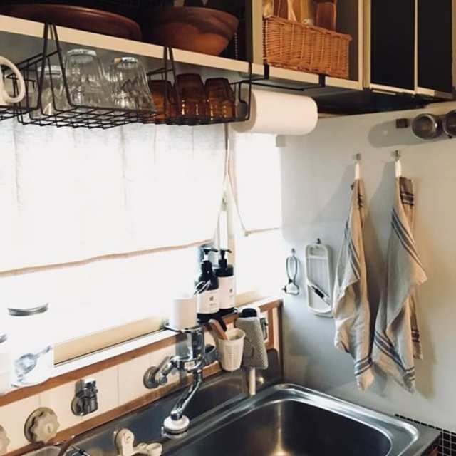 その隣に置かれた棚も、ダイニングと同じ色で、奥行きが小さくオープンで抜け感のあるものをご自身で製作。ゾーンごとにガラスのものでまとめるなど、色が増えすぎないことやまとまりをつくることを意識されているそう。