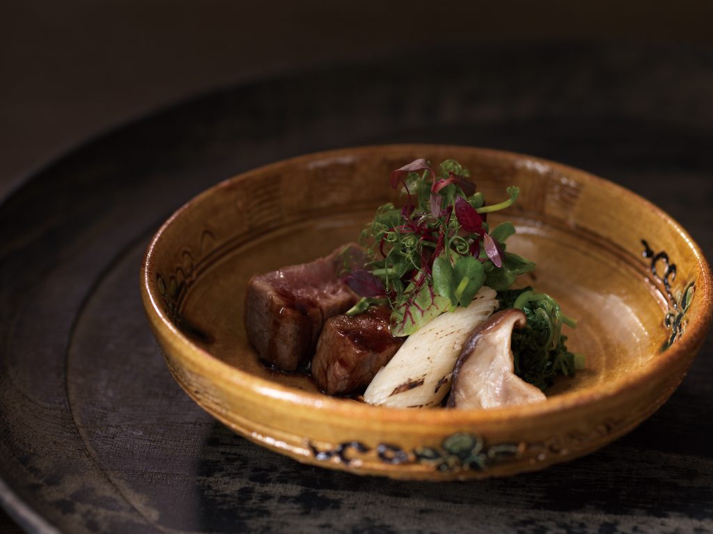 御料理 茅乃舎の目玉は、毎月内容が変わるコース料理。料理人が一つひとつの素材と向き合い、その持ち味を丁寧に引き出した、手間ひまのこもった料理が並びます。
