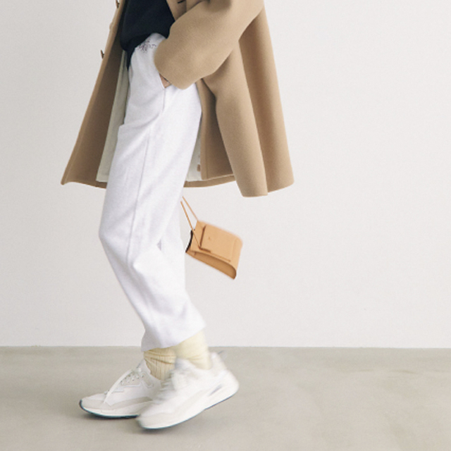 クリーンなホワイトデニムを使った、気分までシャキッと整うセットアップスタイル。上下を白でつなぐことで完成度が高まり、忙しい朝でもサマ見え。全体の引き締め役として黒セーターを腰巻きすれば、シンプルなのに印象に残る装いに。
