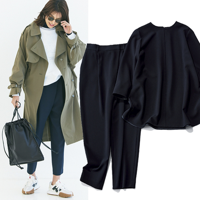 動きやすさ重視の日こそ頼れるのが、軽やかな楽ちんパンツ。ゆったりシルエットでも、ジャケットやシャツの真面目アイテムとスタイリングすればラフになりすぎず、きれいめカジュアルにしっかり着地します。送り迎えからお出かけまで対応できる、アクティブママにもおすすめの着こなしです。