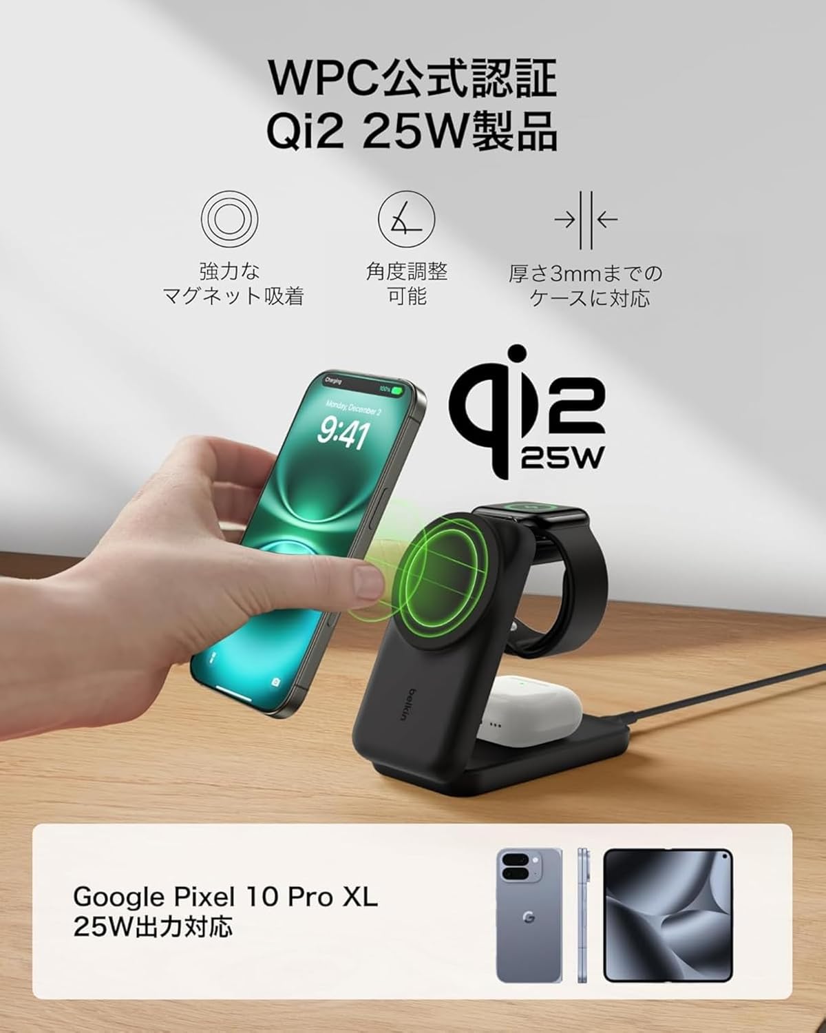 春は、仕事も忙しくなりがち。そんな時に活躍するのが、スマホやイヤホンの同時充電が叶うワイヤレス充電器。世界初の最大25W出力に対応しているから、時間に追われる朝や仕事中でも高速でフルチャージします。コンパクトに折りたためるから、出張や旅行先でもスマートに使えます。
