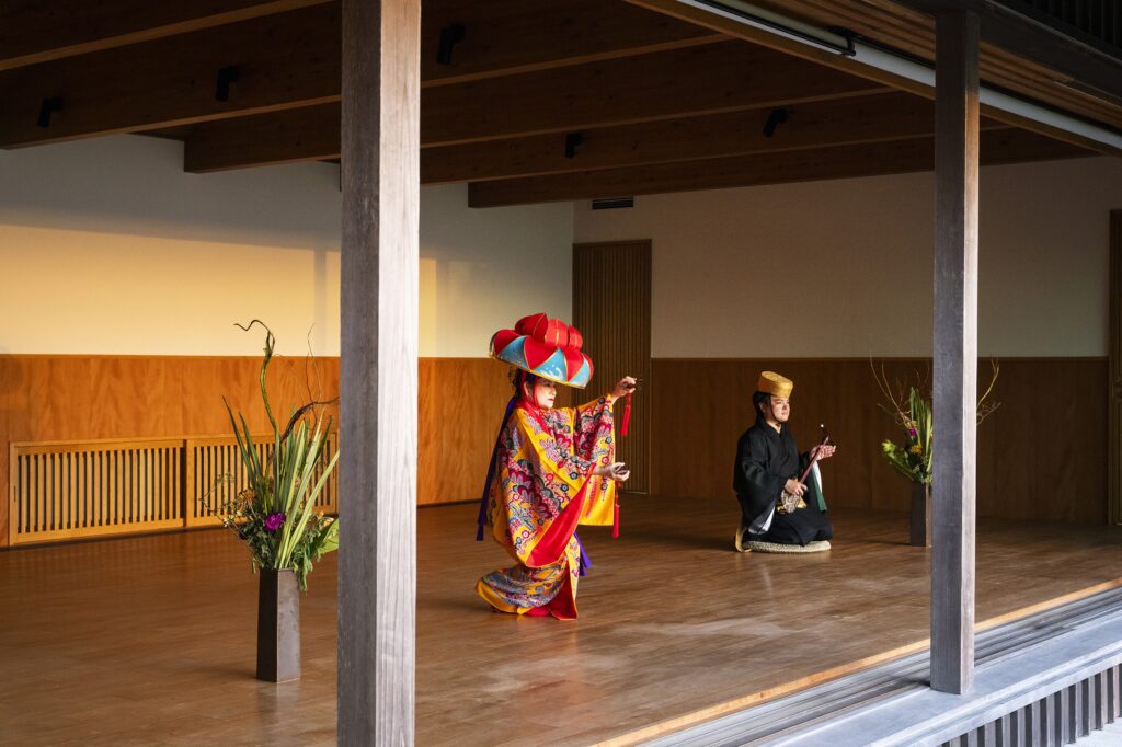 海風がそよぐ敷地内の道場では、かつて海辺に集まって女性たちが歌い踊っていた「はまうり」にちなんだ演目を鑑賞。はまうりではフーチバー※4 餅を食べる習慣があることから、フーチバー香る泡盛とともに華やかな演奏を楽しみます。夕陽できらめく海を眺めながら、波の音と琉球の音色に浸る優美なひとときです。