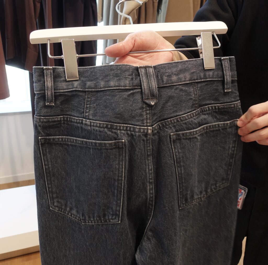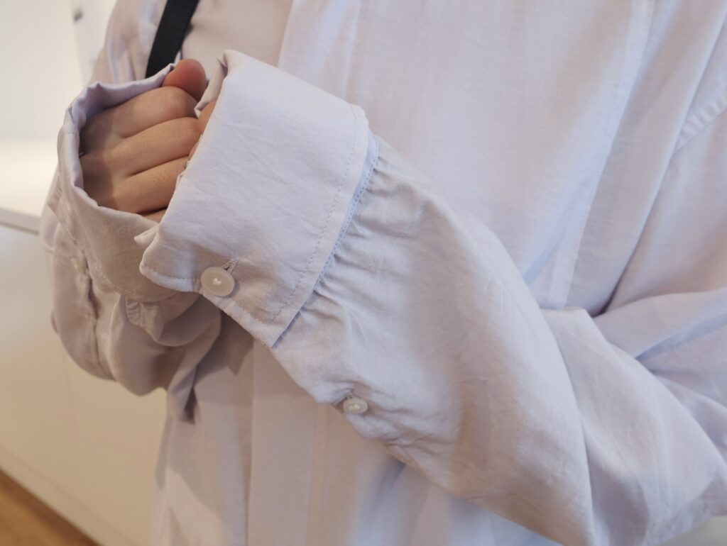 両サイドに入ったスリットによって、パンツのポケットにも手を添えやすい仕様に。袖丈を調整できるボタンも備わっていて、細部まで使いやすさに配慮されています。デザイン性だけでなく、着用時の心地良さまで丁寧に考えられているのが印象的でした。
