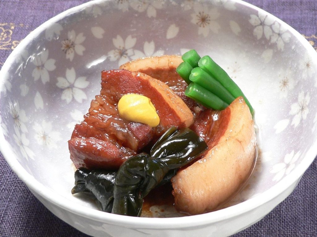 ゆでた豚肉を3~4cm角に切って鍋に入れ、昆布、だし、調味料を入れ、紙蓋をして中火にかけ、煮立ったら弱火にして1時間半煮込む。